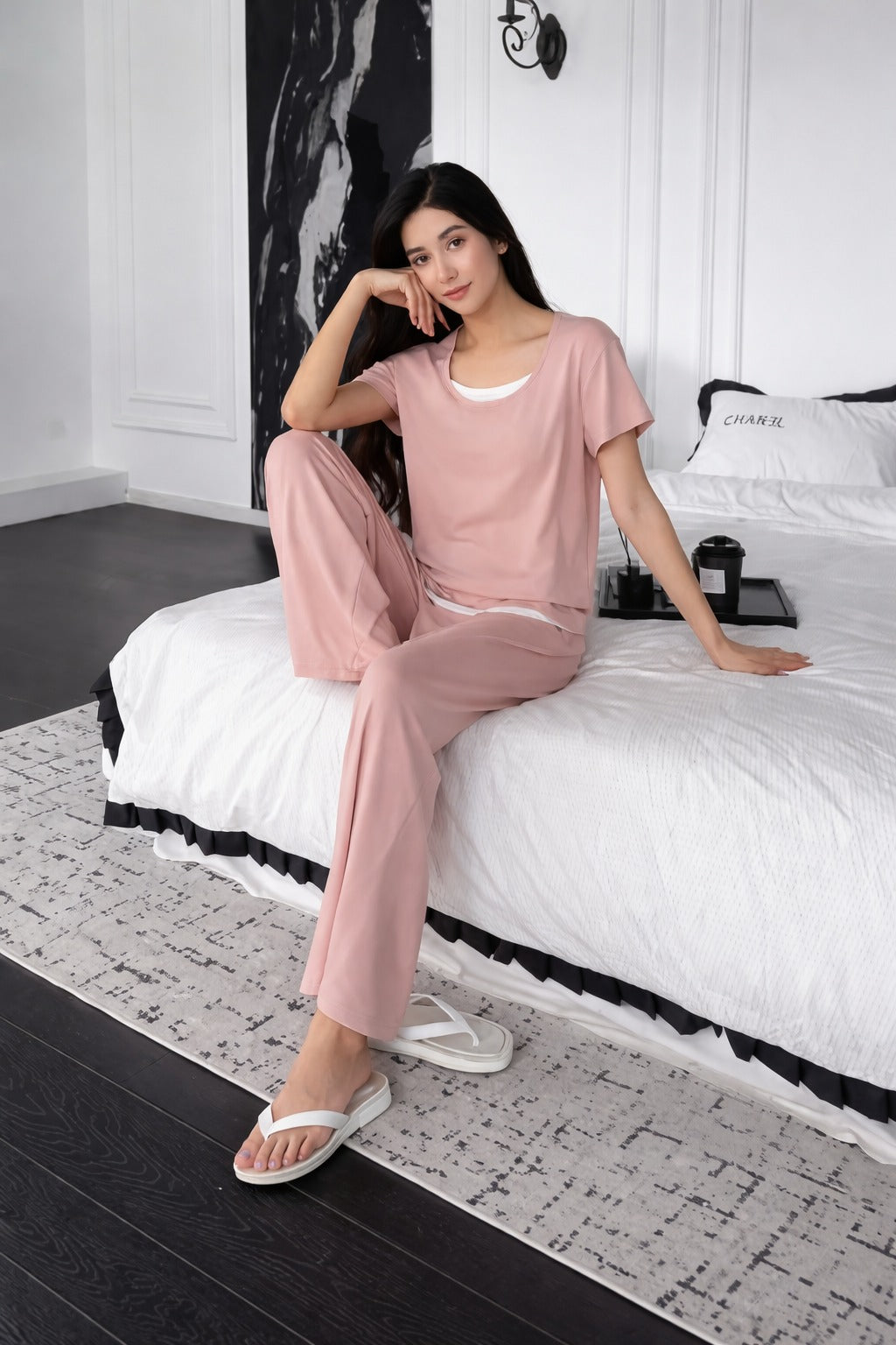 (New) Black Round Neck with white cut sleeves pipen with cut pipen plazo night suit