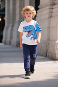 white with BIG blue Dinosour with blue printed pajama kids suit
