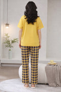 Yellow Cute Duck Printed half sleeves t shirt with check pajama night suit for her